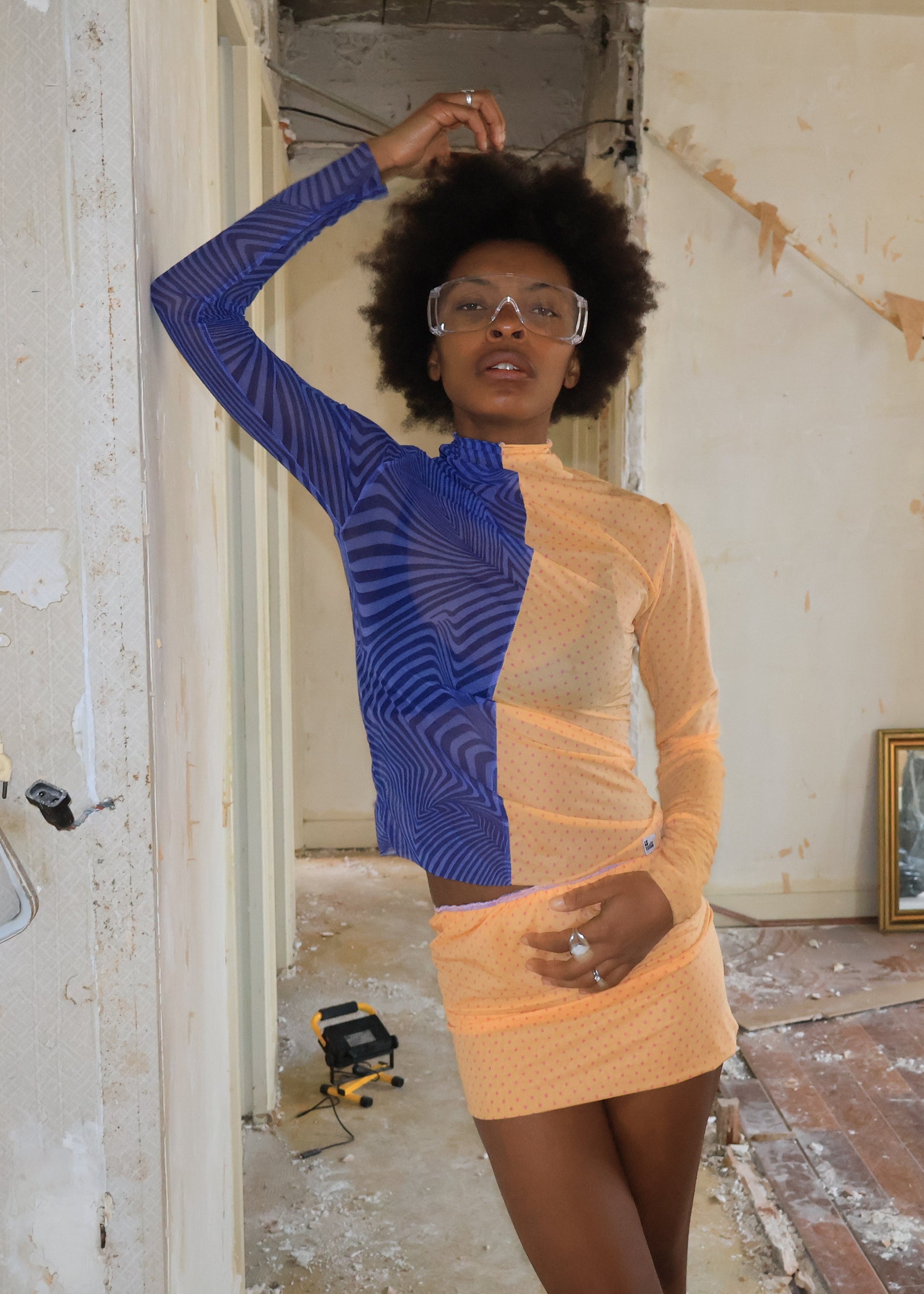 Haut en mesh confectionné à partir de deadstock sourcé en recyclerie, dans une démarche d’upcycling et de mode écoresponsable. Chaque pièce valorise des matières existantes pour une mode plus durable et engagée.